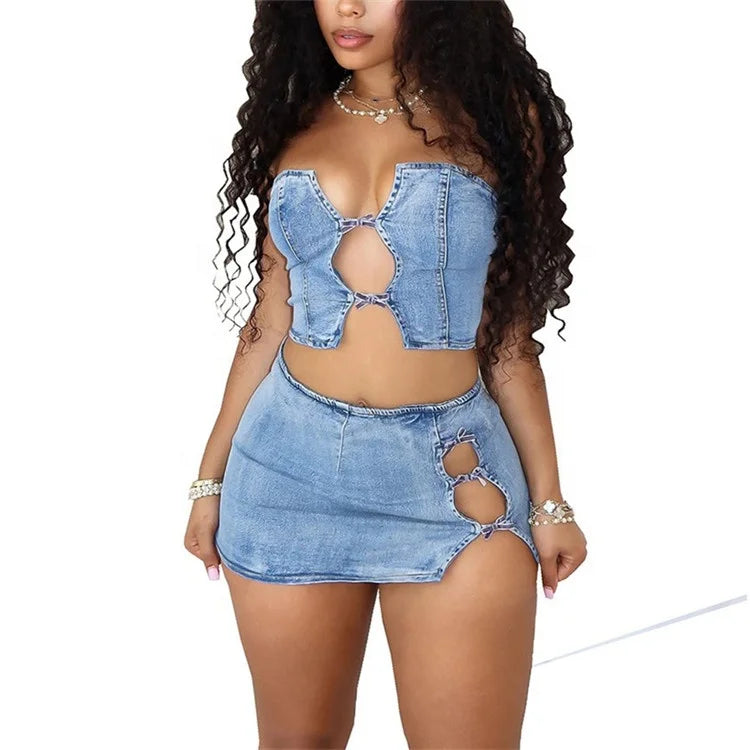 Not So Innocent - Lace Up Hollow Out Denim Skirt Set