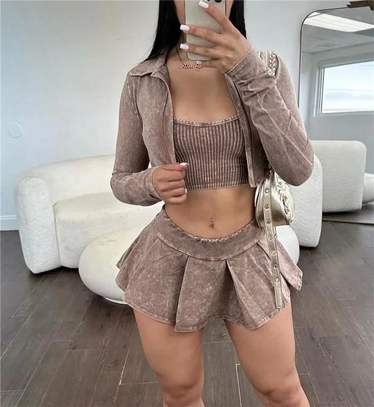The Walk In The Park Pleated Skirt Set offers a sophisticated and stylish 3-piece ensemble for women. The set includes a camisole, long sleeve coat, and mini skirt, all in a solid washed and printed design. Perfect for casual streetwear outfits that exude effortless elegance.